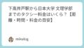 以下は昼間・一般道を利用した場合の参考値です。お茶の水駅から専修大学神田キャンパスまでは徒歩でもアクセスできますが、タクシーなら短時間で到着します。