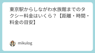 東京駅(丸の内・八重洲)からしながわ水族館(品川区・勝島)へタクシー移動する際の、距離・時間・料金の目安を分かりやすくまとめました。イルカやアシカのパフォーマンスが人気で、家族連れにぴったりの水族館です。料金・時間の目安以下は昼間・一般道を...
