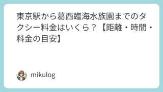 東京駅(丸の内・八重洲)から葛西臨海水族園(江戸川区・臨海町)へタクシー移動する際の、距離・時間・料金の目安を分かりやすくまとめました。東京湾を望む広大な公園内にあり、クロマグロの群泳が人気の水族館です。料金・時間の目安以下は昼間・一般道を...