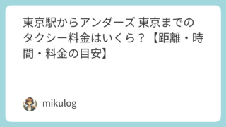 東京駅(丸の内・八重洲)からアンダーズ 東京(港区・虎ノ門ヒルズ)へタクシー移動する際の、距離・時間・料金の目安を分かりやすくまとめました。ラグジュアリーでありながらも温かみのあるおもてなしと、虎ノ門ヒルズの高層階からの絶景が魅力です。料金...